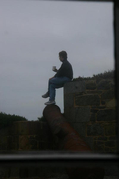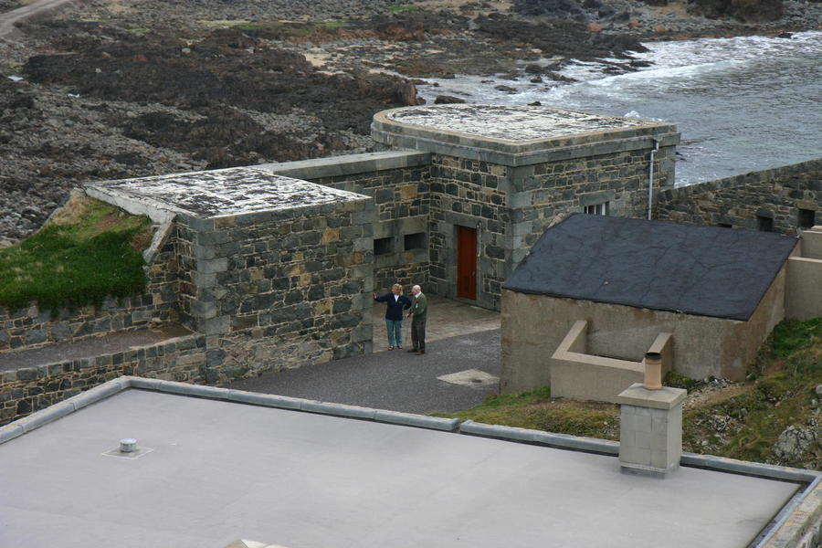 | Beryl and Peter on the upper battery looking out towards Casquets and Ortac. |