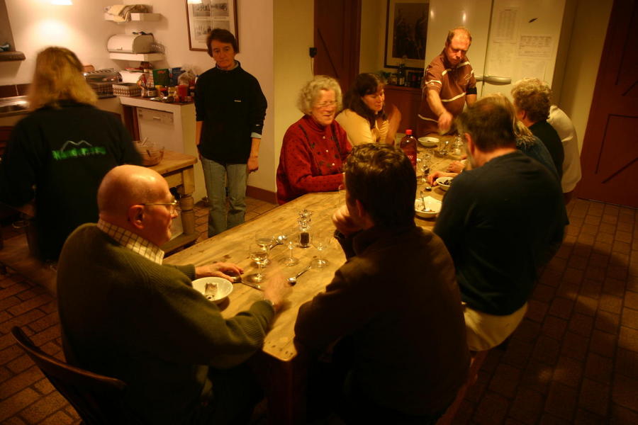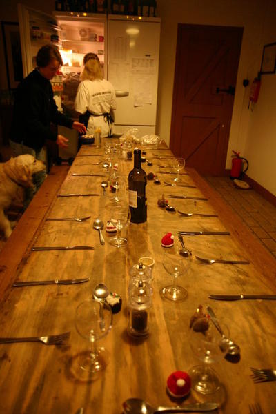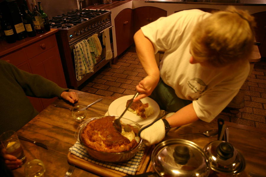 | Monday night and only 7 to feed. Jane made cheese soufflé for 7 while Andrew made fish pie for 13 (to freeze for Boxing Day). |