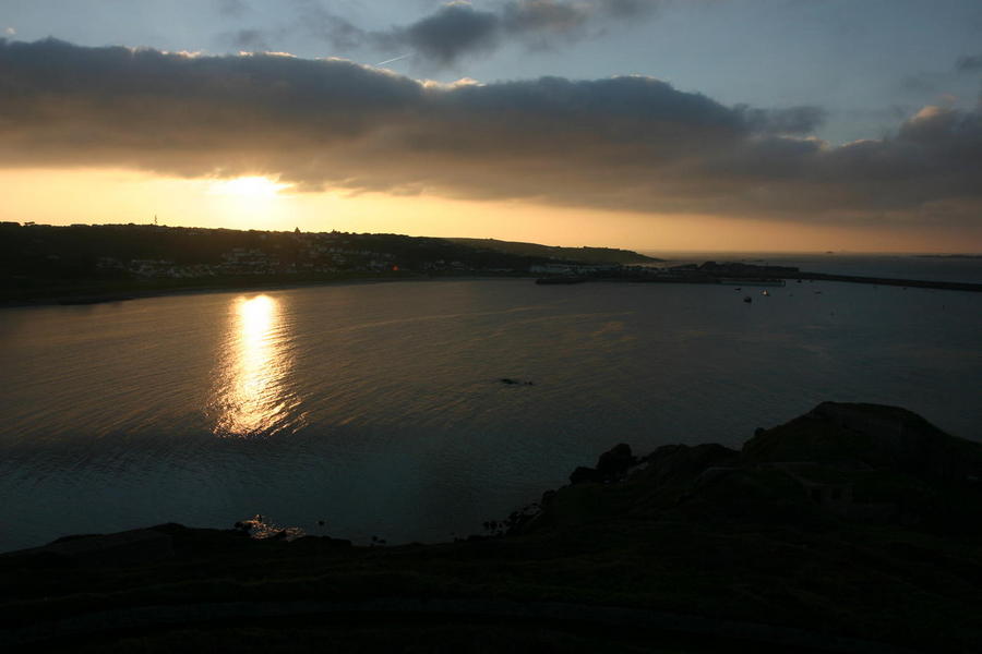 | Sunset over Hennaine Bay with Fort Clonque on the right. |