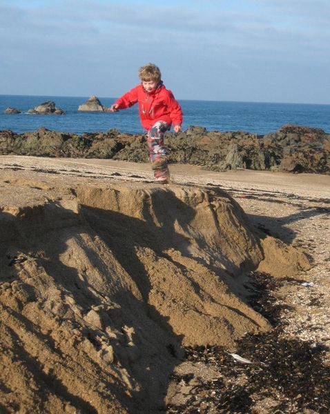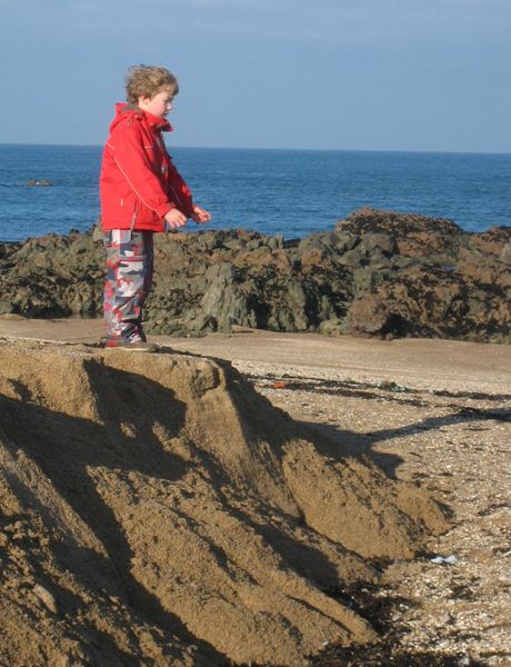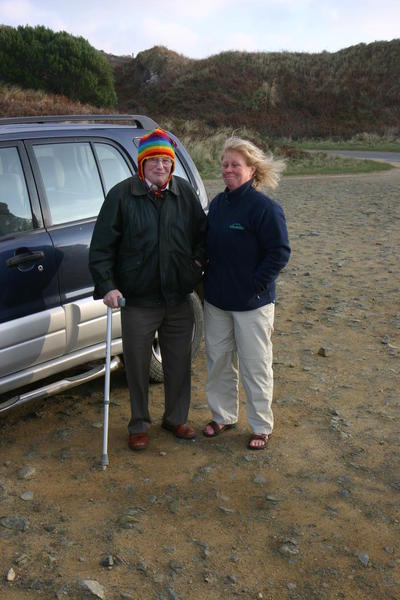 | The wind got up at Corblets Bay so Rob borrowed Jane's hat. |